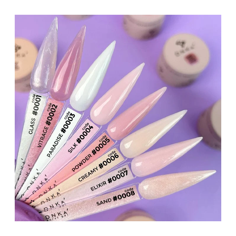 DNKa’ Acryl Gel to wszechstronny materiał, który umożliwia łatwe modelowanie na szablonach lub formach, zapewniając bardzo naturalny wygląd i korygując architekturę naturalnych paznokci. Dzięki użyciu tego produktu łatwo można wzmocnić i przywrócić paznokcie, a także naprawić uszkodzone krawędzie lub pęknięcia. Dzięki swojej miękkiej, samo-wyrównującej się konsystencji, ten materiał jest łatwy w użyciu i zmniejsza potrzebę nadmiernego pilnikowania. Może być łatwo rozprowadzany na powierzchni za pomocą miękkiego pędzla i specjalnej cieczy, nie powoduje również uczucia pieczenia podczas polimeryzacji. Po utwardzeniu pozostawia lekką lepką warstwę. Kolekcja obejmuje 8 najbardziej popularnych odcieni: #0001 Glass (przezroczysty); #0002 Vitrage (półprzezroczysty różowy); #0003 Paradise (biały); #0004 Silk (blady różowy); #0005 Powder (różowy); #0006 Сreamy (jasny beż); #0007 Elixir (różowy z połyskiem); #0008 Sand (beżowy z połyskiem).