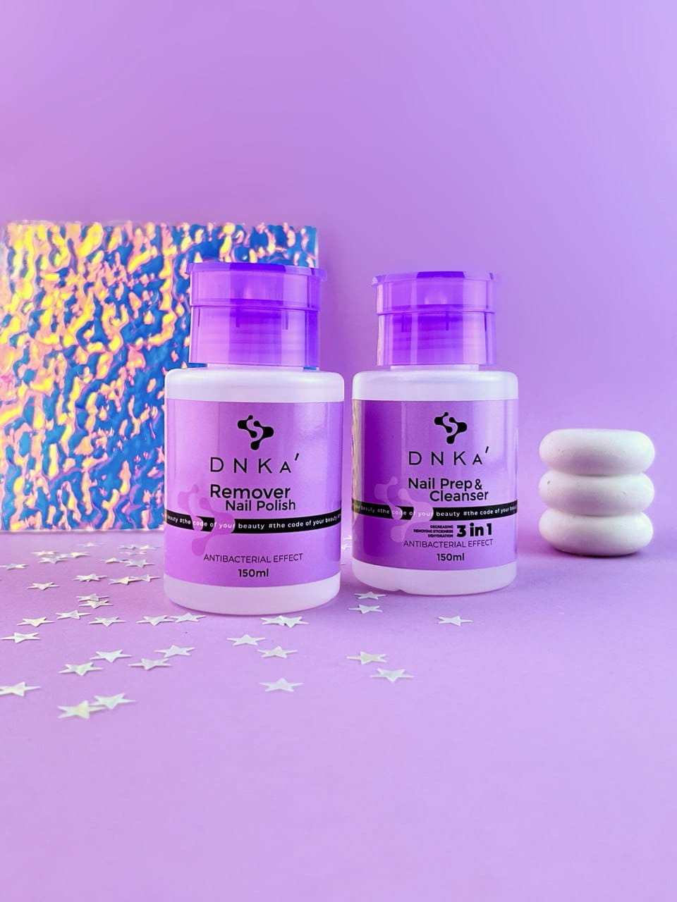DNKa' Nail Prep & Cleanser 3 in 1 to profesjonalny produkt, pomagający w przygotowaniu paznokci do nakładania sztucznych materiałów.. Ten wyjątkowy produkt pełni trzy funkcje: odtłuszcza i odwadnia płytkę paznokcia, usuwa warstwę dyspersyjną oraz wzmacnia przyczepność naturalnych paznokci do materiału sztucznego. Płyn ten jest nieodzowną częścią procesu nakładania lakieru hybrydowego, bazy, przedłużania paznokci żelem lub akrylożelem, tzn pomaga przygotować płytkę paznokcia oraz zapewnia trwałość i stabilność. Posiada wygodną butelkę z pompką, co zapewnia oszczędne zużycie i maksymalną wygodę pracy.