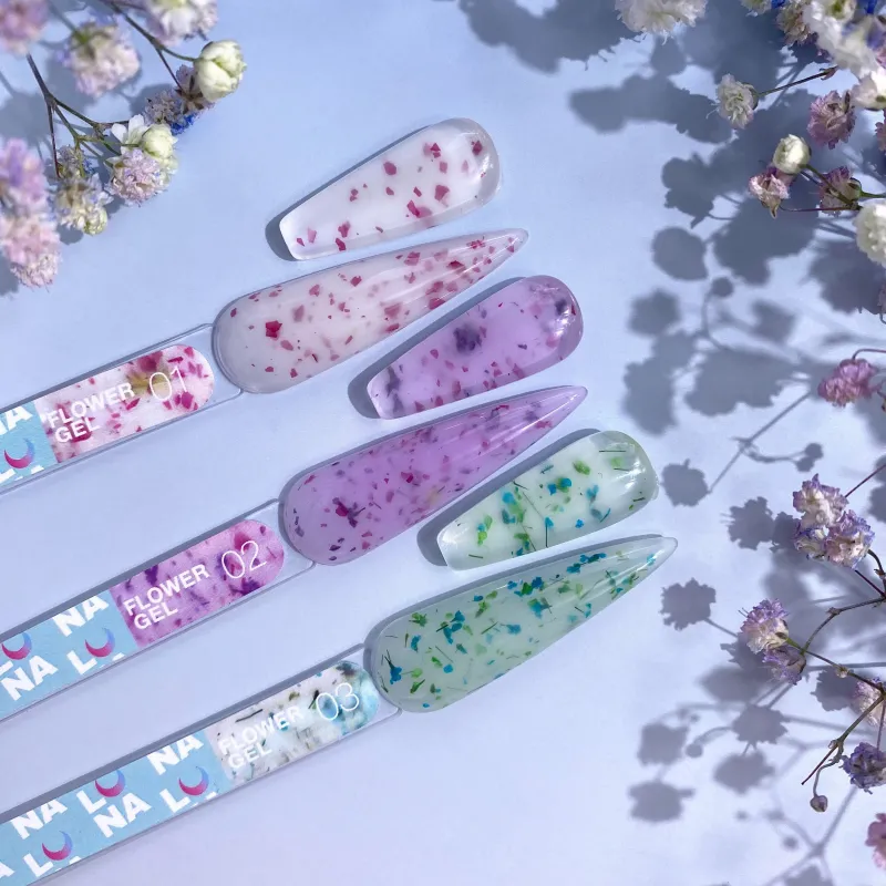Flower Gel to mleczny żel z suszonymi kwiatami przeznaczony do modelowania, wzmacniania i przedłużania.