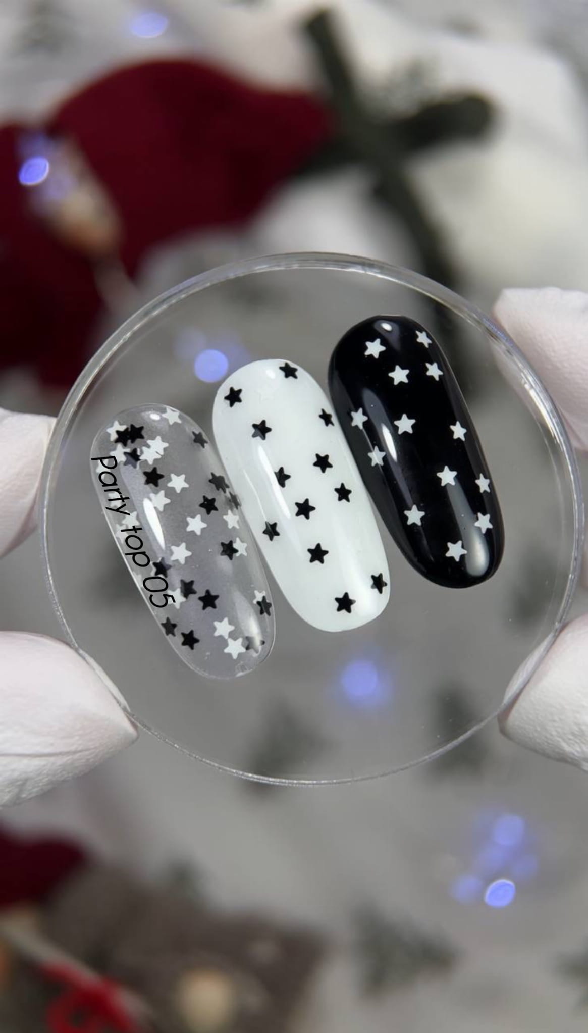 NAILSOFTHEDAY Party top 05 – przezroczysty top z białymi i czarnymi gwiazdkami, bez lepkiej warstwy, 10 ml.