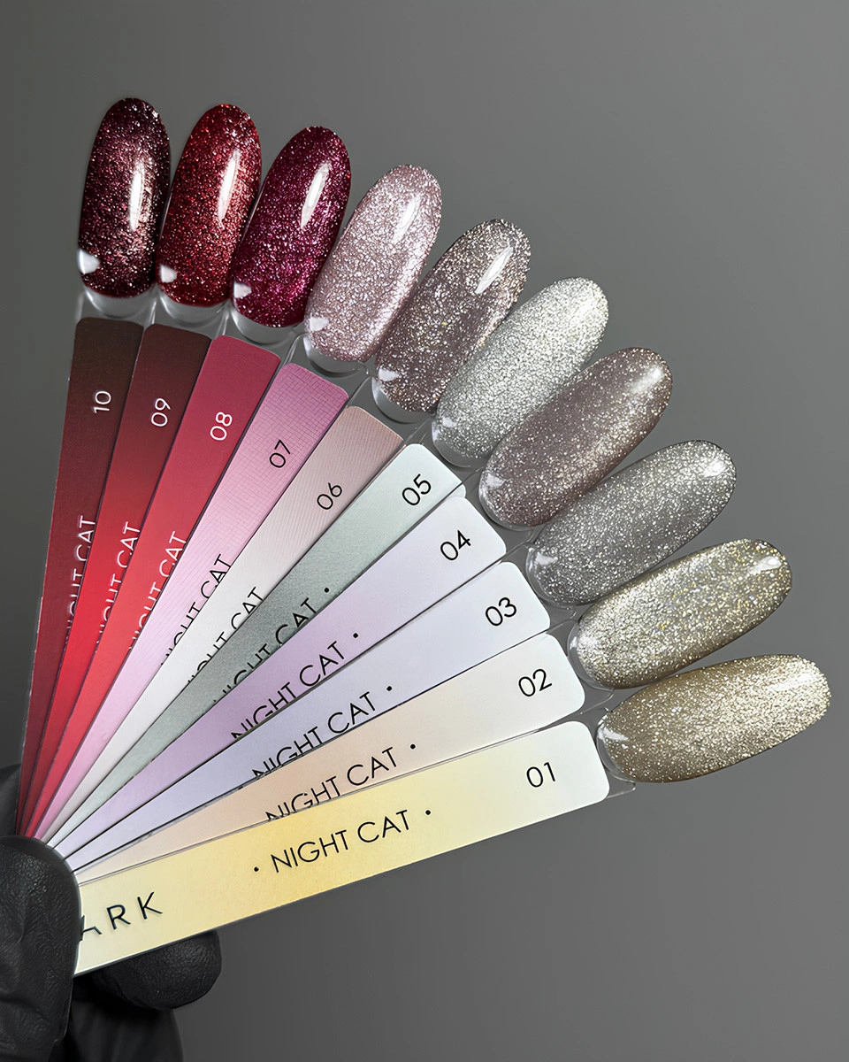 DARK GEL POLISH NIGHT CAT to pigmentowane kolorowe lakiery żelowe z efektem kociego oka, oferujące szeroką paletę starannie dobranych odcieni dla każdego stylisty paznokci.