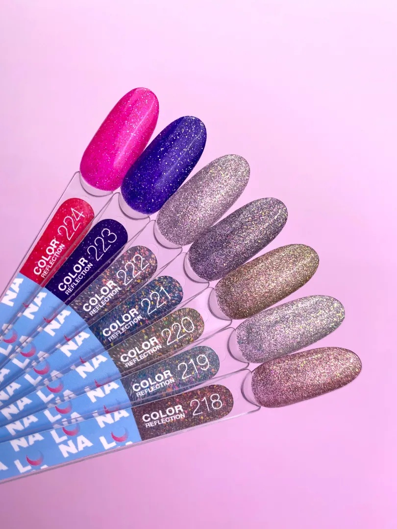 LUNAMOON Color Reflection to lakier hybrydowy o wyjątkowym efekcie refleksyjnego połysku. Zawiera drobny, świetlisty pyłek, który pięknie odbija światło i tworzy efekt delikatnego migotania. Średnia konsystencja ułatwia aplikację i zapewnia idealne samopoziomowanie bez zalewania skórek. Lakier doskonale prezentuje się jako kolor samodzielny, w połączeniu z topem błyszczącym lub w roli akcentu przy stylizacjach salonowych.