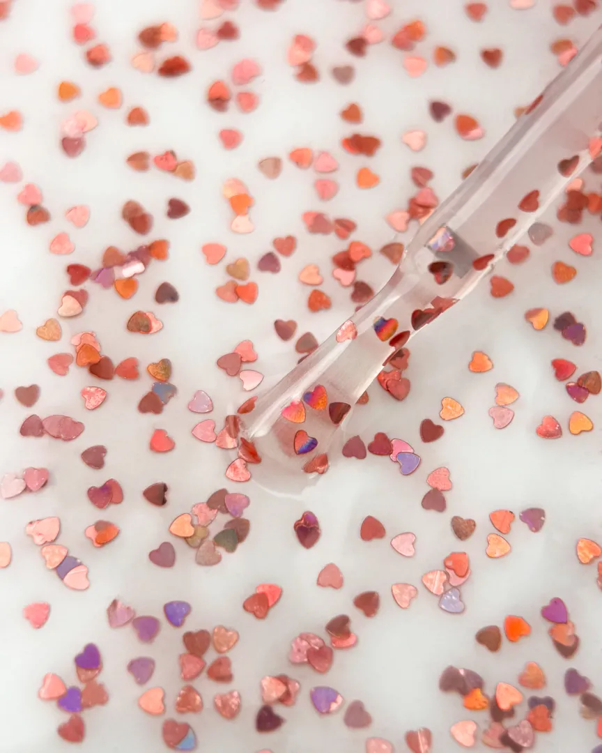 Top Heartbeat to dekoracyjny top hybrydowy bez warstwy dyspersyjnej, który nadaje stylizacji wyjątkowy, romantyczny charakter. Zawiera ultra-cienkie drobinki w kształcie serduszek, równomiernie rozłożone w transparentnej bazie, dzięki czemu manicure wygląda lekko, estetycznie i bardzo efektownie. Top nie zmienia koloru lakieru bazowego, a jedynie podkreśla go subtelnym, designerskim akcentem. Średnia konsystencja ułatwia aplikację, top dobrze się poziomuje, nie spływa na skórki i tworzy gładkie, błyszczące wykończenie. Idealny do stylizacji walentynkowych, romantycznych, wedding nails oraz nowoczesnych zdobień typu clean & cute.